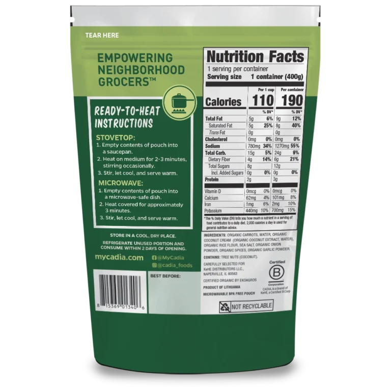 CADIA® organic foods are fresh and flavorful. Made from premium ingredients, sourced from around the world. Made with all organic ingredients – carrots, water, coconut cream, rice flour, & spices.