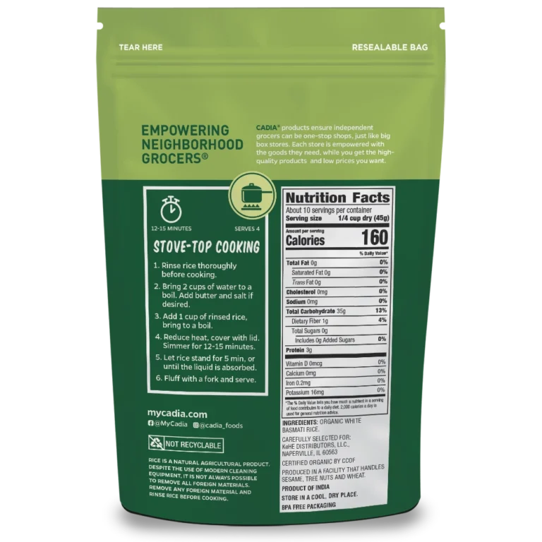 CADIA® 16 oz. Rice is organically grown and harvested using Good Agricultural Practices (GAP). The gusseted pouch packaging is resealable for easy storage.